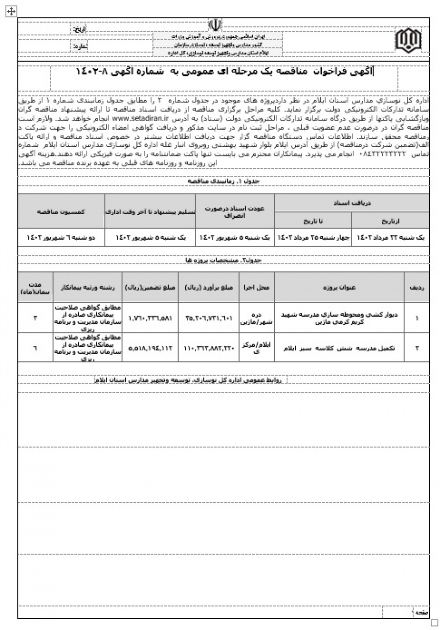 آگهی فراخوان مناقصه یک مرحله عمومی اجرای ایزوگام مدارس سطح استان ایلام